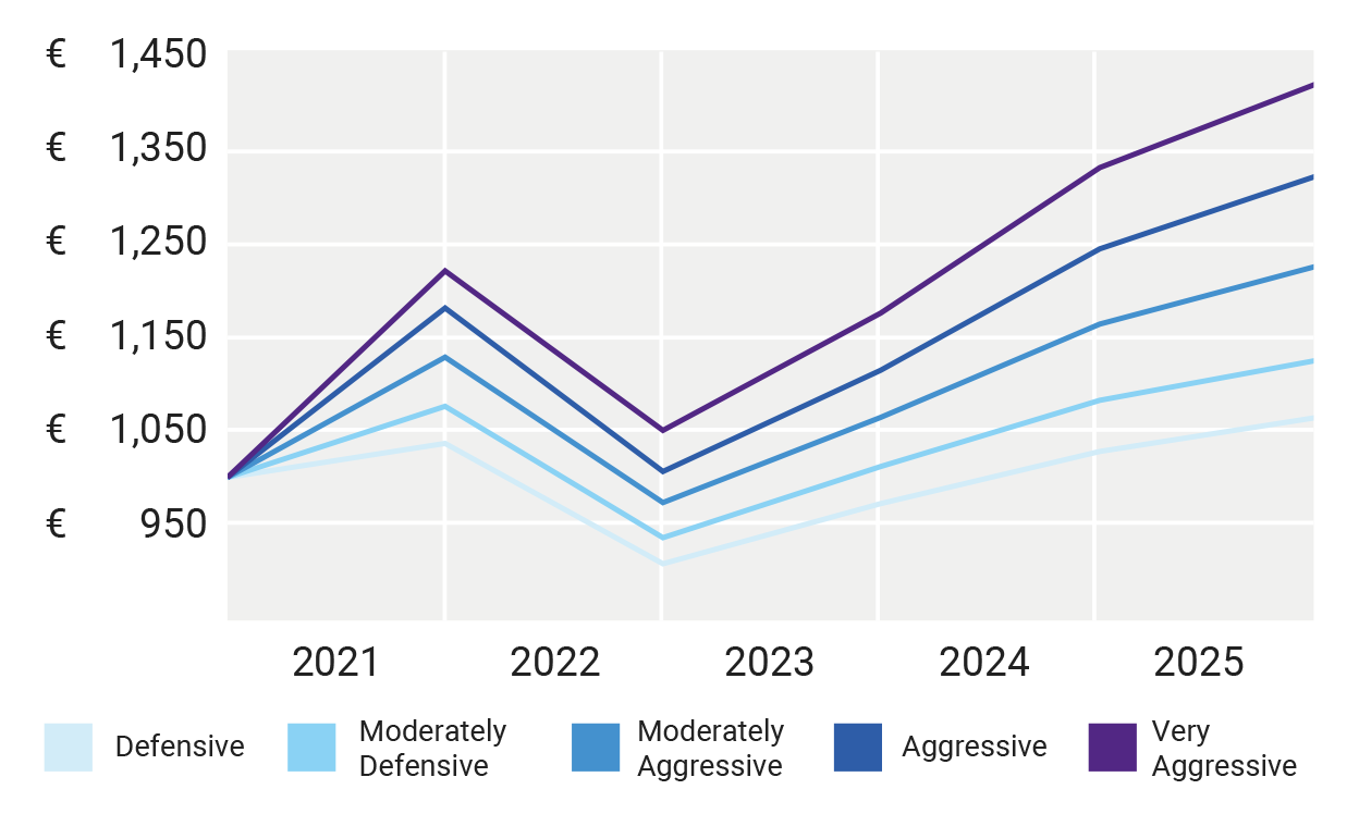 This graph shows you what your return would have been, if you had, for example, made a one-off investment of €1,000 in one of the five funds on 1 January 2021.